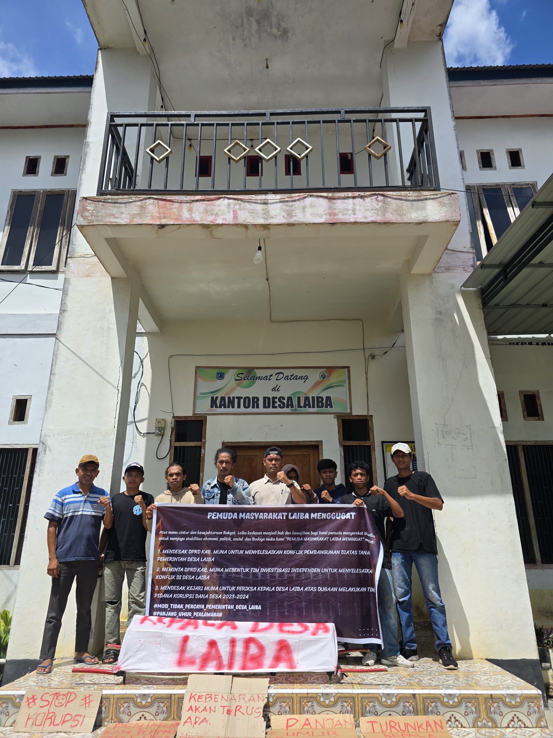 MUNA—MEDIASEKAWAN.COM.|| Ratusan masyarakat, pemuda dan tokoh masyarakat Desa Laiba, Kecamatan Parigi, Kabupaten Muna, menggelar aksi demonstrasi di depan Kantor Desa Laiba Pada, Rabu (11/2/25).