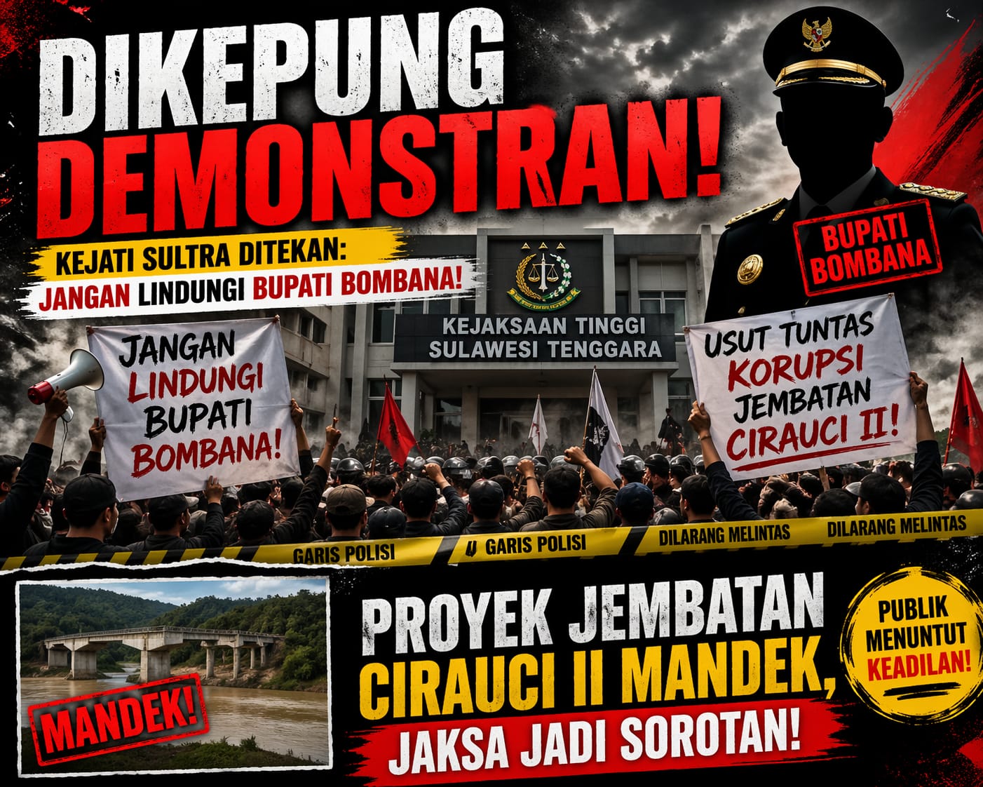 Sorotan tajam diarahkan pada dugaan lambannya penanganan kasus korupsi proyek pembangunan Jembatan Cirauci II. Massa mendesak Kejati Sultra segera menetapkan Bupati Bombana, Burhanudin, sebagai tersangka.