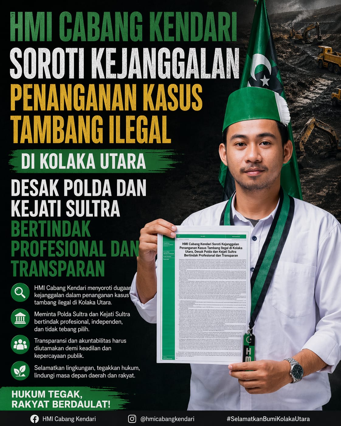 Kendari – Himpunan Mahasiswa Islam (HMI) Cabang Kendari menyampaikan sikap tegas terhadap dugaan ketidakkonsistenan dalam penanganan kasus tindak pidana pertambangan ilegal di wilayah IUP PT Kasmar Tiar Raya, Kabupaten Kolaka Utara, Sulawesi Tenggara.