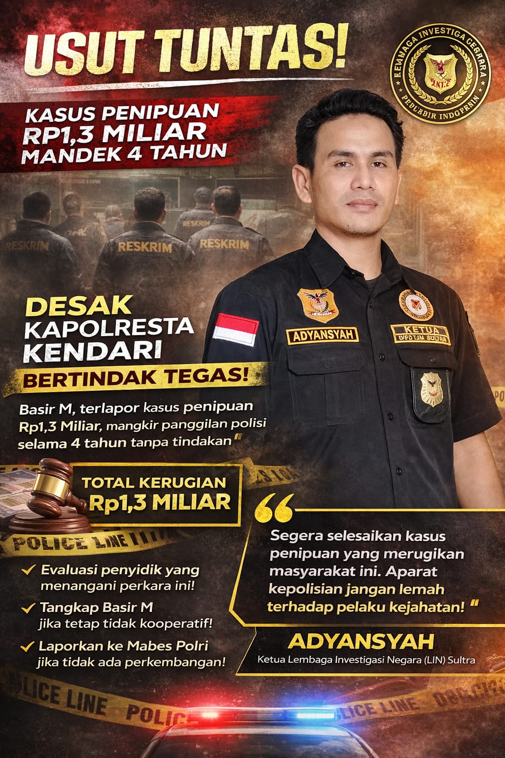 Adyansyah secara tegas mendesak Kapolresta Kendari untuk segera mengambil langkah konkret, termasuk melakukan evaluasi internal terhadap penyidik yang menangani perkara tersebut.