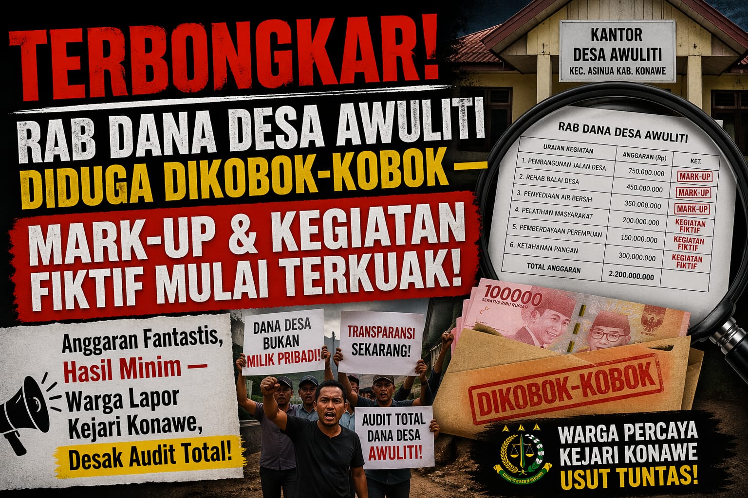 Konawe, (23 April 2026) — Aroma dugaan penyimpangan Dana Desa kembali mencuat. Kali ini, giliran Desa Awuliti, Kecamatan Lambuya, yang menjadi sorotan tajam publik setelah dokumen Rencana Anggaran Biaya (RAB) mulai terbuka dan mengungkap sejumlah kejanggalan serius.